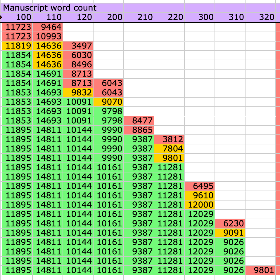 My writing process is usually pretty messy. I have a few scenes in mind and I write them, regardless of where they crop up in the story. When I get stuck, I’m happy to leap ahead to a scene that interests me. This can be seen visually in my “Writing progress” chart. I always split my manuscript up over nine or ten documents, and track word count each week. In this table, each column is a document and is colored to show state of completion down the page – from red (in progress) to green (essentially complete).