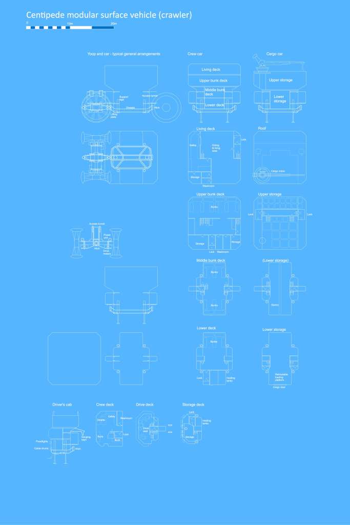 Yoops power the crawler. A yoop is little more than a pair of giant wheels on an axle, together with power and drive machinery, and universal hitches front and rear.