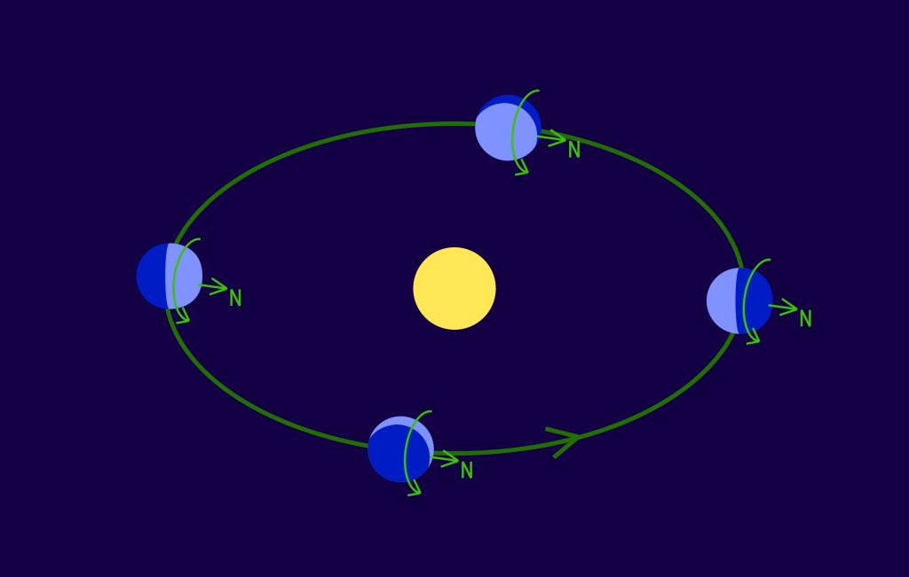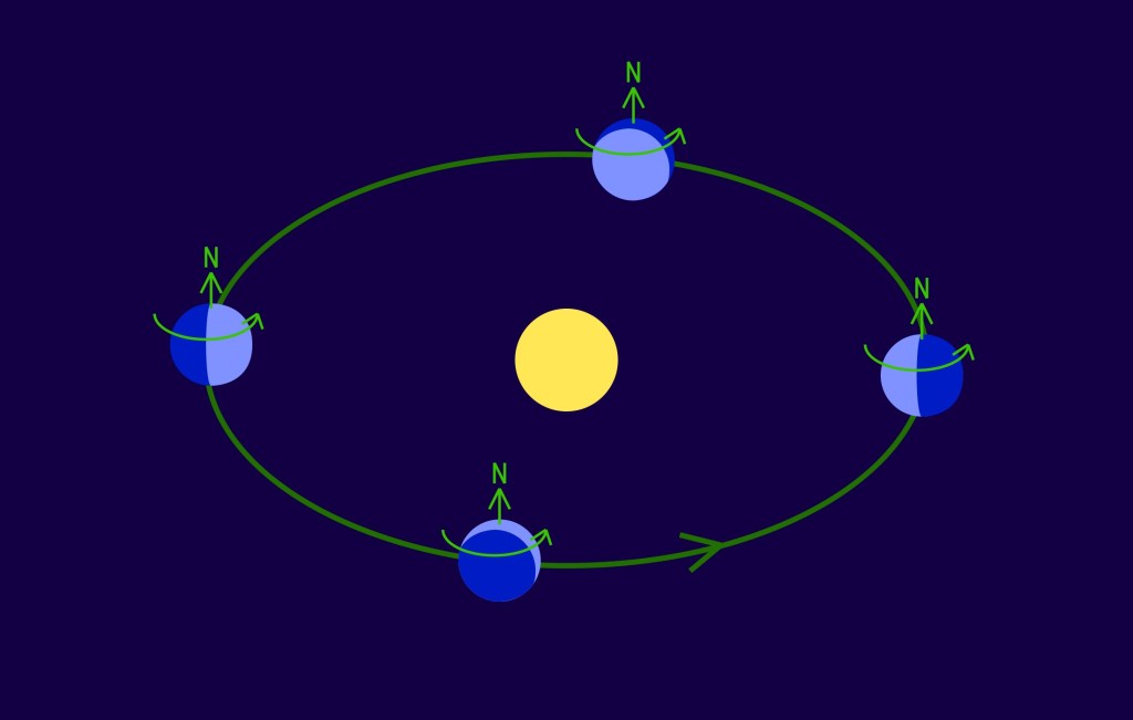 If you were watching it from somewhere outside the solar system you’d see that the planet’s axis is always pointing the same way relative to the universe as a whole. This means that each pole gets a dose of summer sun directly overhead, followed by a long winter where it’s pointing away from the sun.