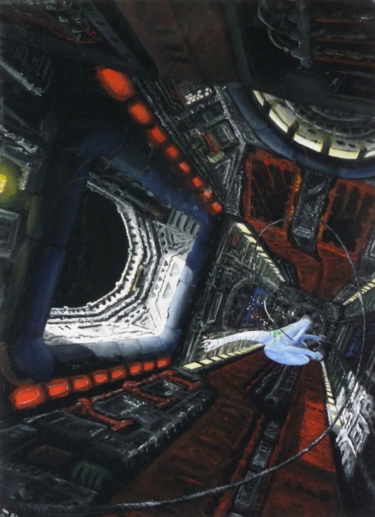 Actually, this looks nothing like the adult Alien, but the overall look was peripherally inspired by the interior sets of Alien – the first of a series of paintings that the movie spawned in my mind – and then evolved from there.