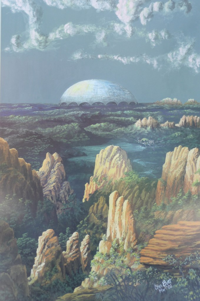I wanted to recreate something of that quality of that light, and that became the foreground. As usual, because I never do just straightforward landscapes, I brought a sci-fi element into play with the massive dome squatting on the horizon.