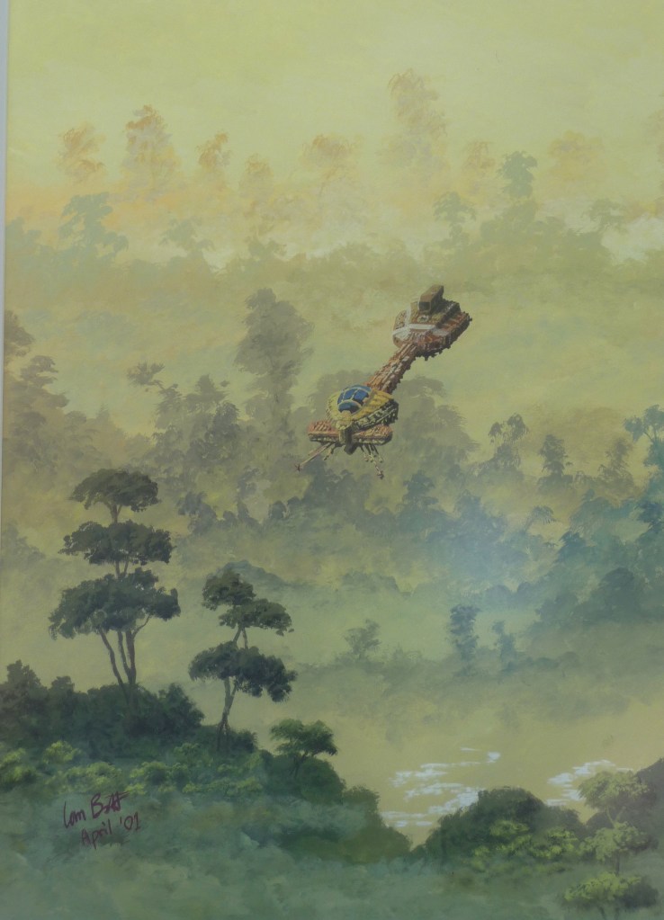 This was very quick to paint. The background was more-or-less completed in one sitting, leaving the insect-like ship to overlay.