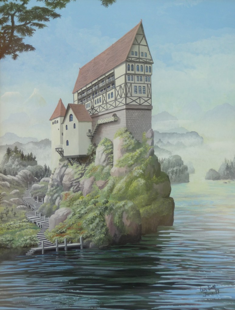 This painting is unusual in that it has no overtly sci-fi theme to it. It could be a scene on Earth, except I know of nowhere that such a building exists. I think of it as a fantasy setting, and it reflects another love – architecture.