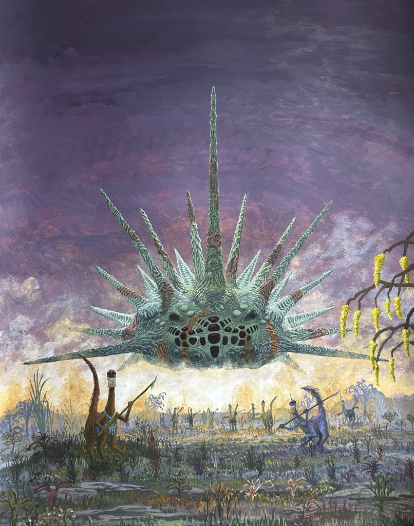 Book cover art for The Videshi Dilemma. Although not an actual scene from the story, this image is roughly true to the appearance of Videshi on the ground, and the ship in the sky, with just a bit of artistic license making the ship somewhat larger than it ought to be.
