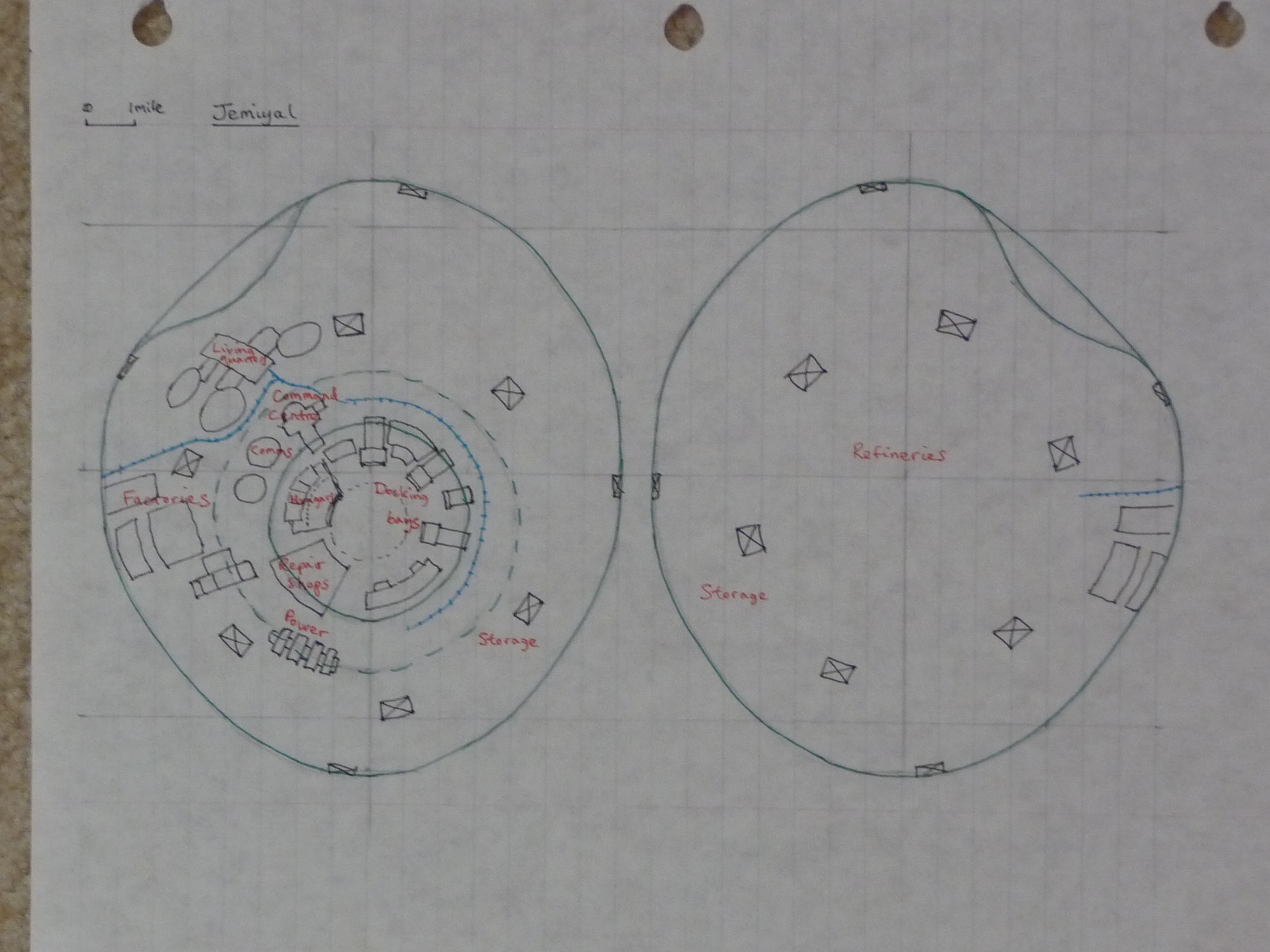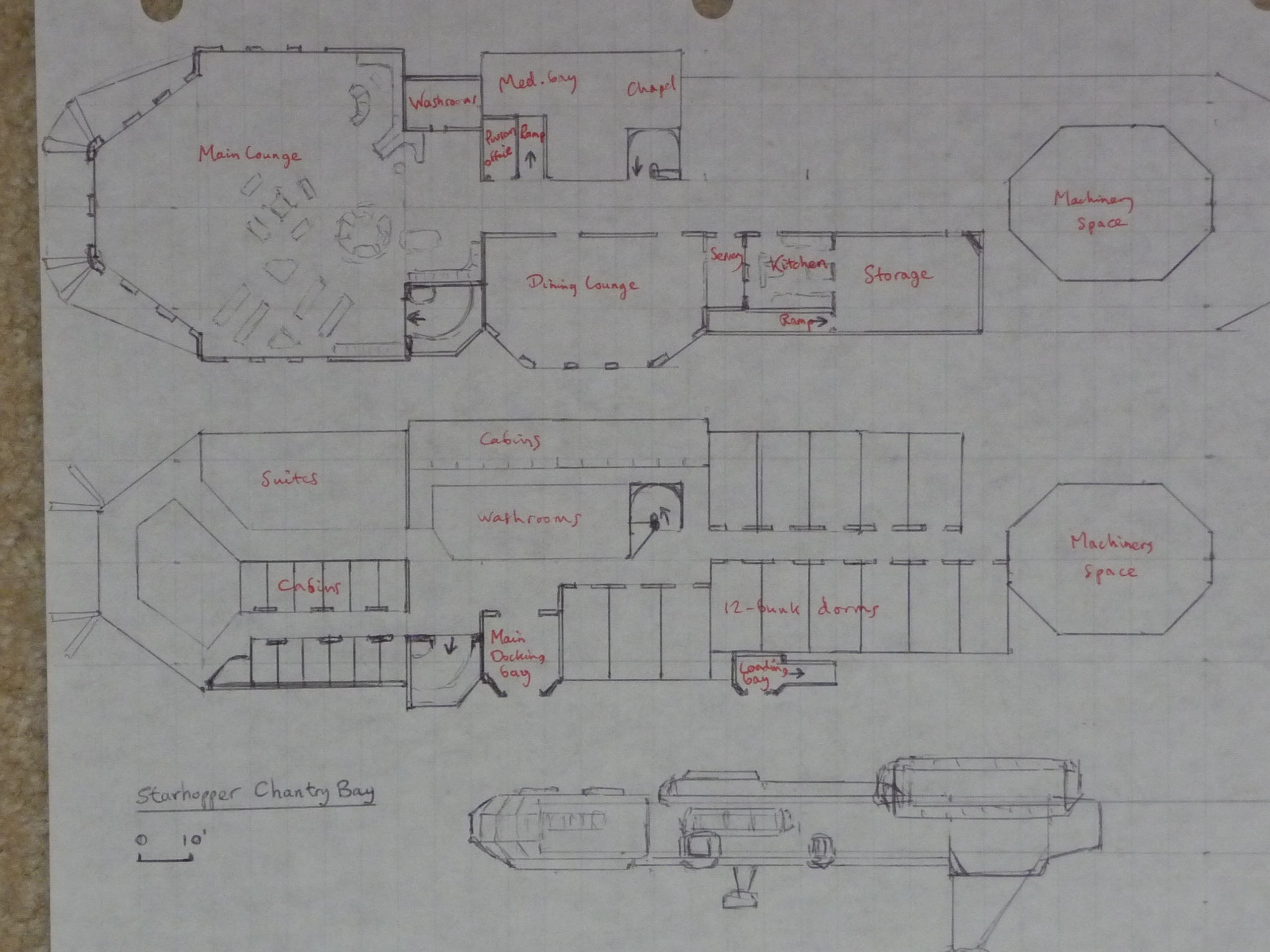 A collection of maps and plans of planets, towns, buildings, and ships. Many of the images are rough hand-drawn sketches that form a large part of my worldbuilding process. You will find that most of these sketches are not only rough but incomplete. For worldbuilding purposes, I generally only flesh out enough detail to guide the story. There are also more complete and polished drawings. Producing those images was not necessary for the writing process, but was a satisfying activity in its own right.