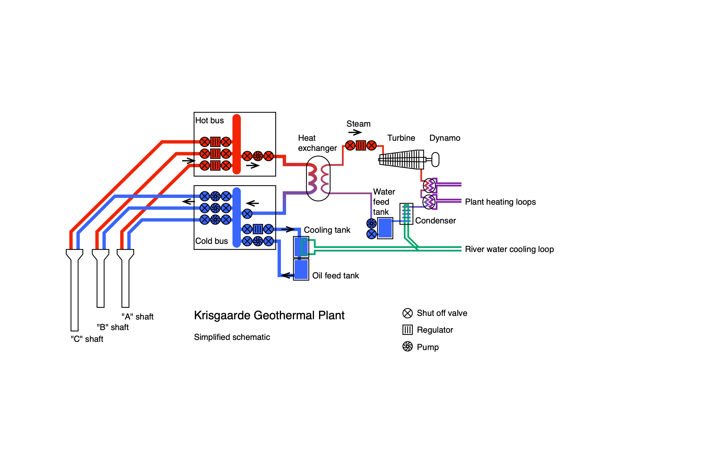The geothermal plant at Krisgaarde. Working notes, and a more formal schematic to show the complexity of the plumbing.